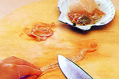 2.貝をひっくり返し、殻を取り除きます。そしてウロ(黒い部分)を摘んで貝柱からヒモなどを取り除きます。